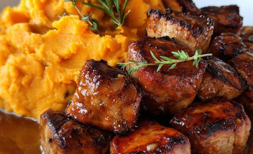 Apple Cider Pork with Mashed Sweet Potatoes is the definition of cozy, fall-inspired comfort food. Tender pork medallions are marinated and simmered in apple cider with aromatics until juicy and flavorful, then served over creamy mashed sweet potatoes. The sweet-savory balance, subtle herb notes, and velvety texture make this dish both comforting and elegant.