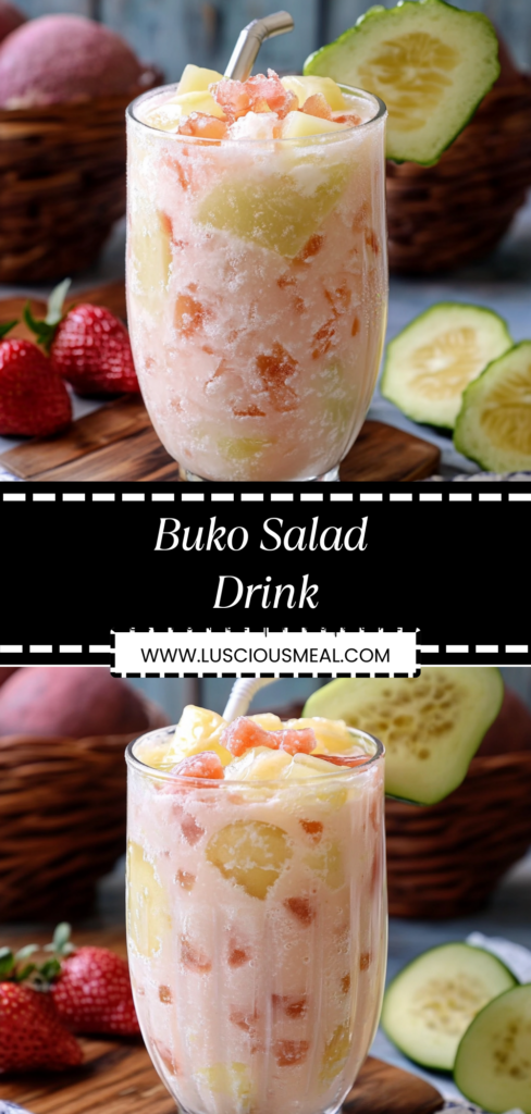 This buko salad drink transforms the beloved Filipino dessert into a refreshing beverage that captures all the creamy, tropical flavors of the original while being perfectly sippable through a straw. The combination of tender young coconut, sweet mixed fruits, and rich cream creates a dessert-like drink that’s both nostalgic and satisfying for hot weather refreshment. If you enjoy this style of creamy fruit drink, you might also like halo-halo shakes, mais con yelo, or other Filipino-inspired beverage treats.