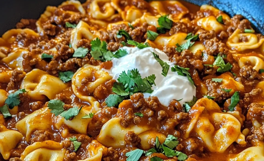 Cheesy Beef Enchilada Tortellini is a comforting fusion dish that blends Tex-Mex flavors with classic Italian pasta. Tender cheese tortellini are simmered in a creamy enchilada sauce with seasoned ground beef, onions, and garlic, then topped with melted mozzarella. The result is a rich, hearty one-skillet dinner that delivers bold flavor with minimal effort.