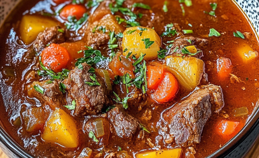 Properly executed beef stew should have meat that’s fork-tender and easily breaks apart while still maintaining its shape rather than falling into shreds. The vegetables should be cooked through and tender but not mushy, holding their shape and providing satisfying texture contrast. The broth should be rich and flavorful with enough body to coat a spoon lightly without being overly thick or gluey. When served, each spoonful should contain a good balance of tender meat, vegetables, and flavorful broth that ties everything together harmoniously.