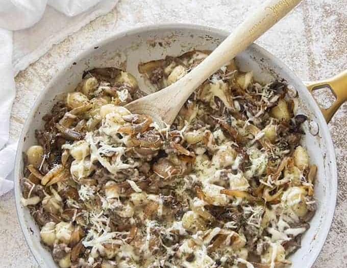 Return the caramelized onions to the skillet and stir to evenly distribute throughout the beef and gnocchi mixture.