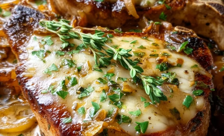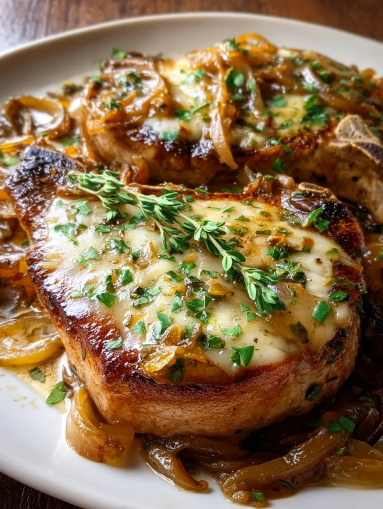 This recipe succeeds by building flavor in layers. High-heat searing creates Maillard browning on the pork, locking in juices. Slow caramelization transforms onions’ natural sugars into deep, complex sweetness. Deglazing captures flavorful browned bits, forming a savory gravy enriched by thyme and beef broth. Finishing in the oven ensures even cooking while melting the cheese into a cohesive, luxurious topping. At approximately 490 calories per serving, it’s indulgent yet balanced for a hearty main course.