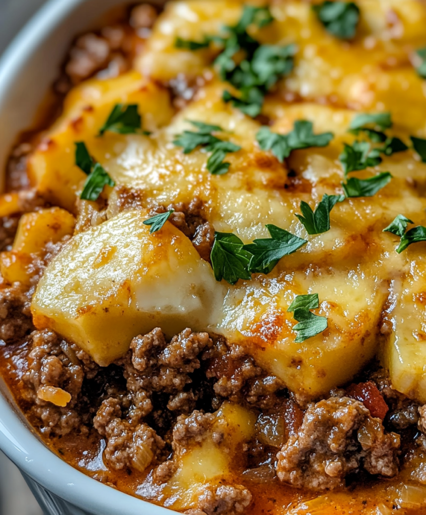 Serve hot, dishing out generous portions that include both the potato topping and the hearty beef mixture beneath.