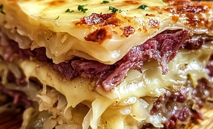 Homemade Reuben Bake transforms the bold, deli-style flavors of a classic Reuben sandwich into a warm, layered casserole. With savory turkey, tangy sauerkraut, creamy Swiss cheese, and rich Thousand Island dressing baked between hearty rye bread, this dish delivers comfort and structure in every slice. The oven melds the ingredients together, creating a cohesive, golden-topped bake perfect for family dinners or casual gatherings.