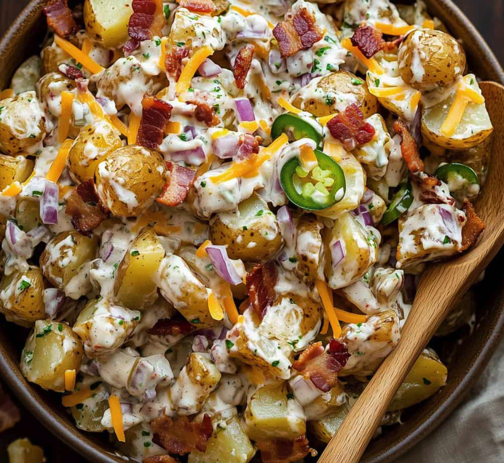 This recipe works by maximizing flavor through roasting, which caramelizes the natural sugars in the potatoes and creates a crisp exterior. The creamy dressing clings better to warm potatoes, ensuring even flavor distribution. The combination of fat (cheese, mayo, bacon), acid (vinegar), and spice (jalapeños) creates a balanced and dynamic profile. At approximately 440 calories per serving, it’s a rich, satisfying side dish with layered textures and bold taste.
