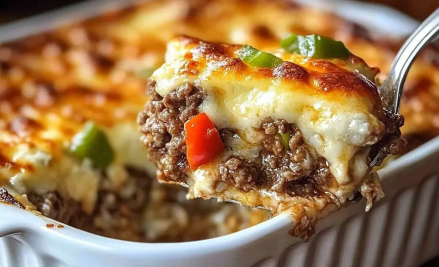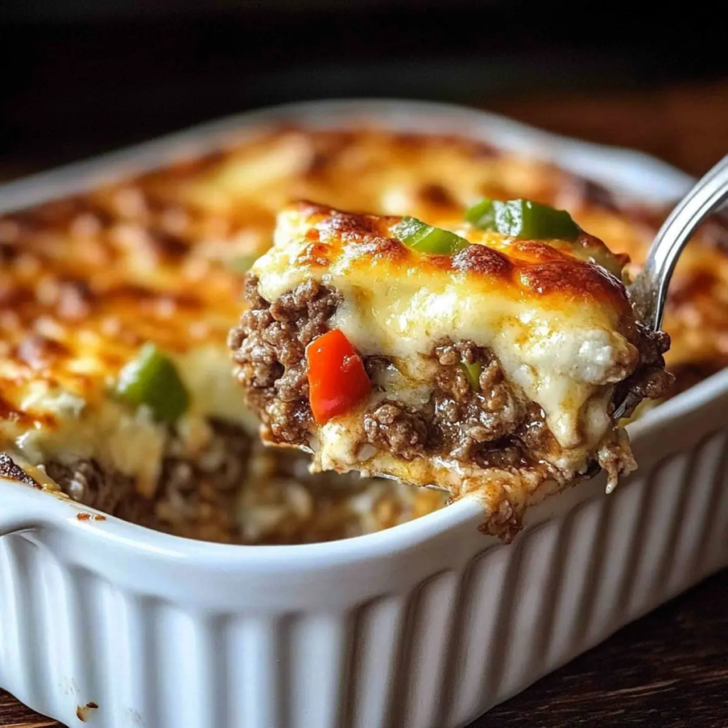 Low Carb Philly Cheesesteak Casserole transforms the iconic sandwich into a hearty, keto-friendly baked dish. Instead of bread, tender ground beef, sautéed peppers, and onions are layered with creamy cheese and baked under a blanket of provolone and mozzarella. The result is a rich, satisfying casserole that delivers the classic flavors of a Philly cheesesteak in a comforting, low-carb format.