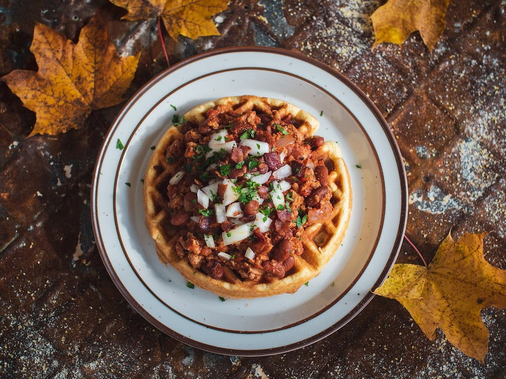 Maple Bacon Bourbon Chili on Cornbread Waffle