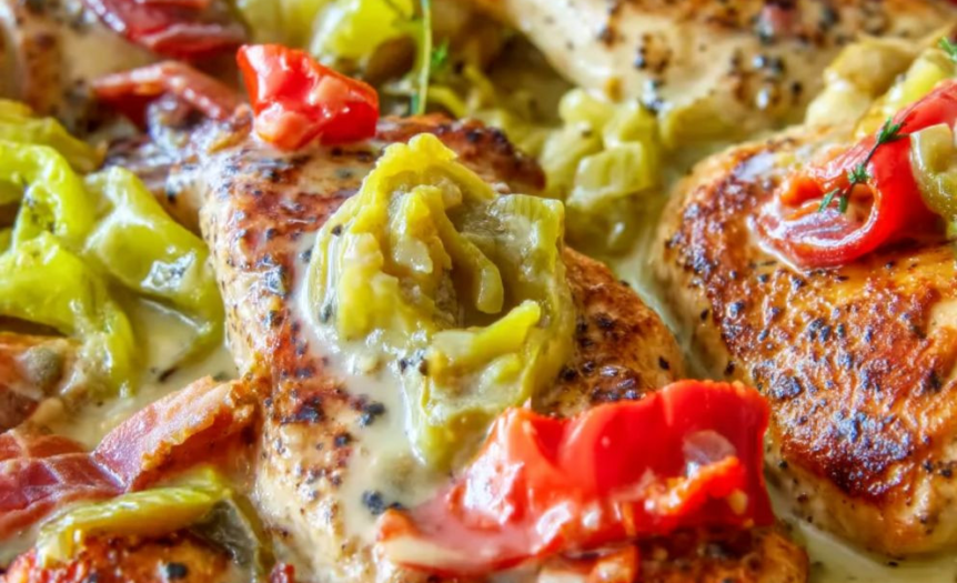 Pepperoncini Chicken Skillet is a bold yet comforting one-pan dinner featuring tender seared chicken simmered in a tangy, creamy pepperoncini-infused sauce. The briny bite of the peppers balances the richness of the cream, creating a flavorful dish that pairs beautifully with pasta or rice. Designed for busy weeknights, this recipe delivers layered flavor with minimal cleanup.