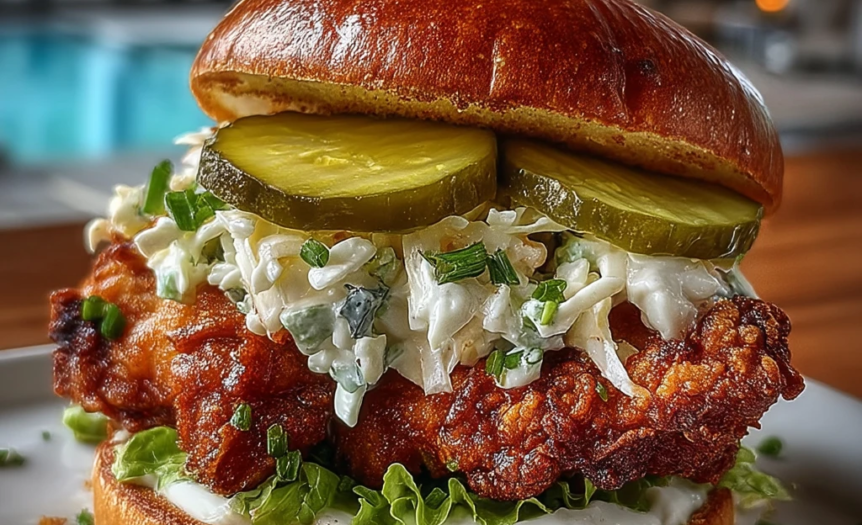 This Pickle Brined Fried Chicken Sandwich delivers everything you want in a standout sandwich—crispy, golden chicken with a juicy interior, balanced by tangy pickle brine, creamy slaw, and fresh crunch. The combination of textures and bold flavors creates a satisfying bite that’s savory, slightly acidic, and irresistibly rich.