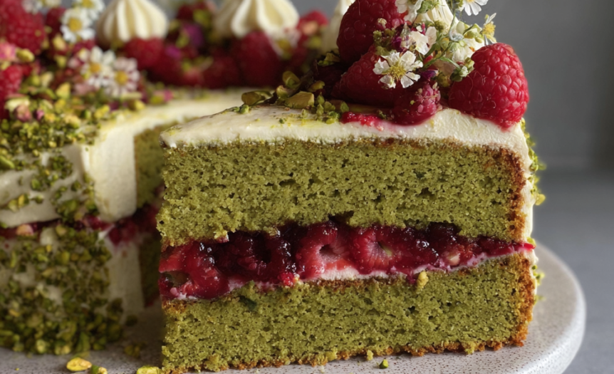 This cake is naturally nutty from the pistachios, with a subtle hint of almond that enhances the overall flavor. The raspberries offer a bright contrast—both visually and in taste—cutting through the richness with their tartness. The texture is moist but not dense, with a light crumb that stays soft for days.