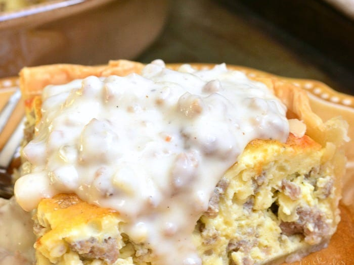 - Serve warm – Slice quiche and top each portion with sausage gravy