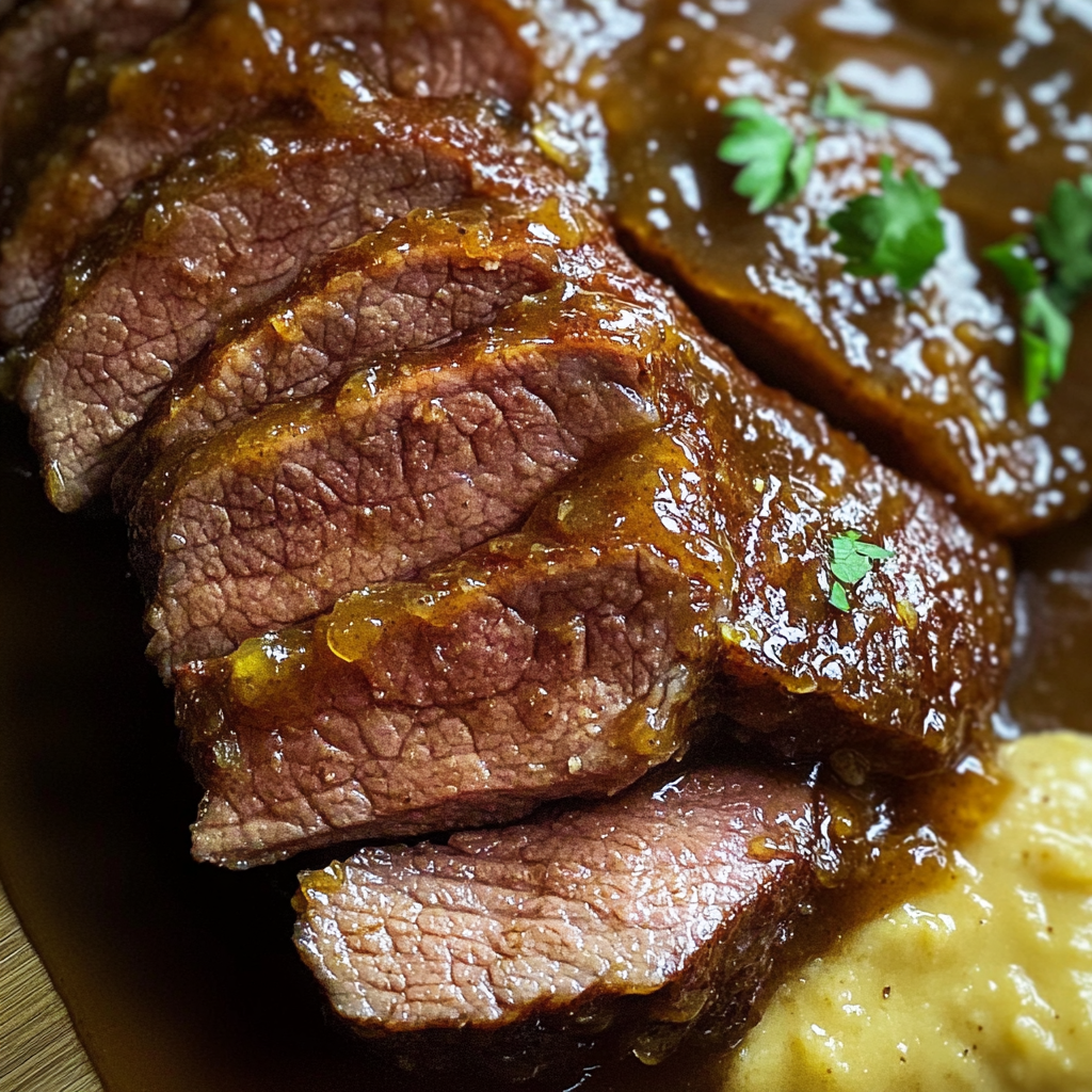 This tender, glazed beef recipe combines savory and sweet flavors for a delicious main dish that’s perfect for family dinners or special occasions. The slow cooking process ensures the meat becomes tender and flavorful, while the brown sugar honey glaze adds a delectable finishing touch.