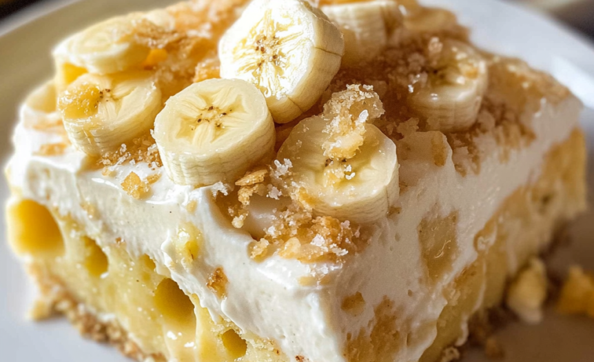 This dessert combines the best of both worlds – classic banana pudding and moist poke cake. Each slice delivers the perfect balance of creamy pudding, fresh bananas, crunchy wafers, and tender cake!